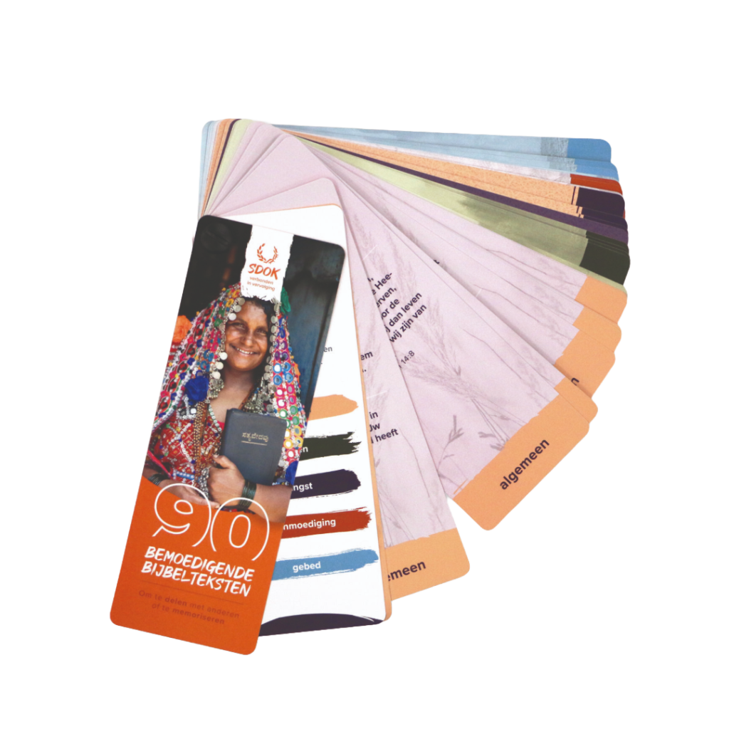 Zoek je weleens naar een bemoedigende bijbeltekst, bijvoorbeeld om naar iemand te sturen? In de SDOK-waaier vind je 90 bemoedigende bijbelteksten uit de Herziene Statenvertaling (HSV). Deze teksten kun je gebruiken om anderen te bemoedigen of uit je hoofd te leren. De waaier is handzaam en je bergt ‘m makkelijk op. De teksten zijn verdeeld over vijf verschillende thema’s, zo vind je snel een passende bijbeltekst.